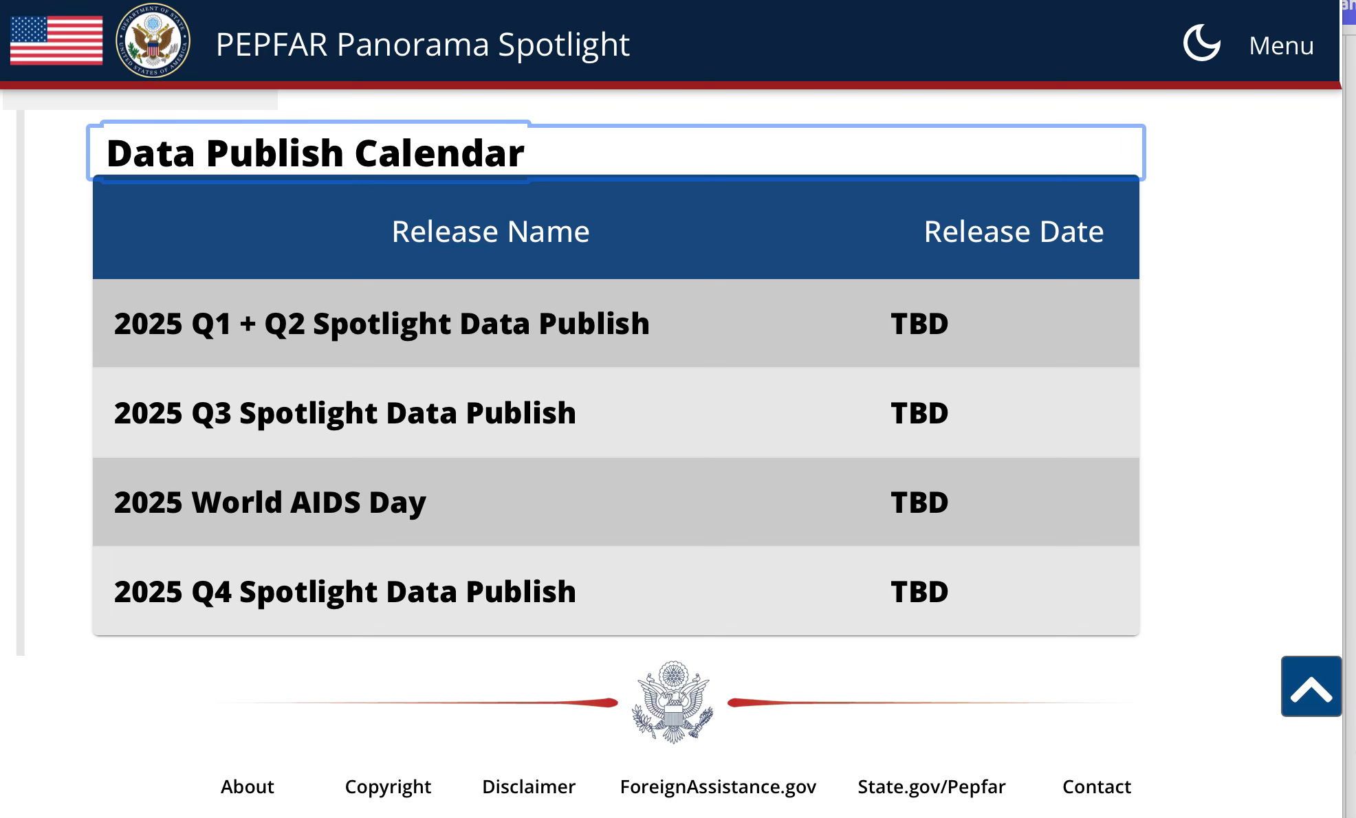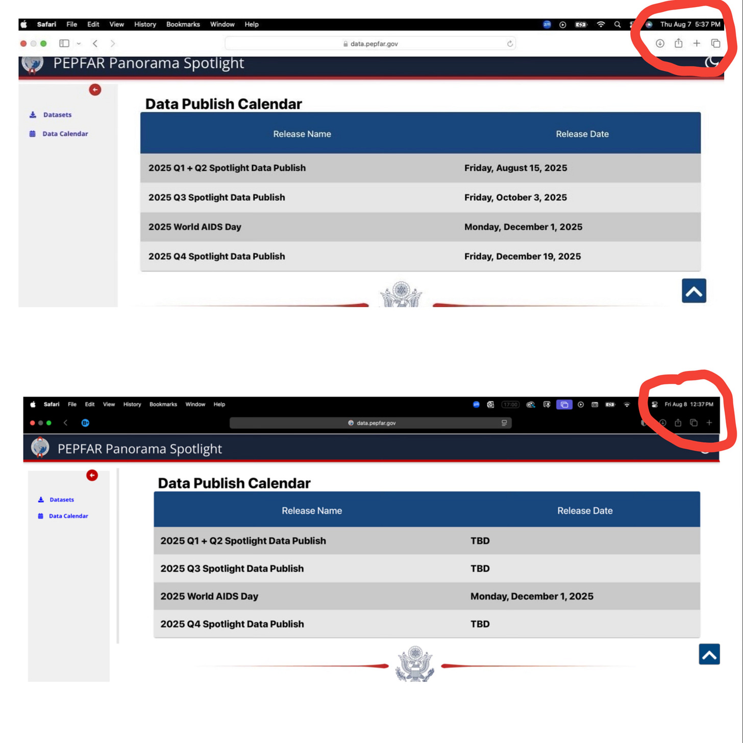 The US President’s Emergency Plan for AIDS Relief (PEPFAR) has, at some point in the past 60-70 days, removed World AIDS Day from its calendar for public data sharing.1 As of August 8 2025, World AIDS Day , which falls on December 1, was the sole remaining milestone on the data.pepfar.gov calendar. On that date, all of the other scheduled time points shifted from actual dates to TBD.