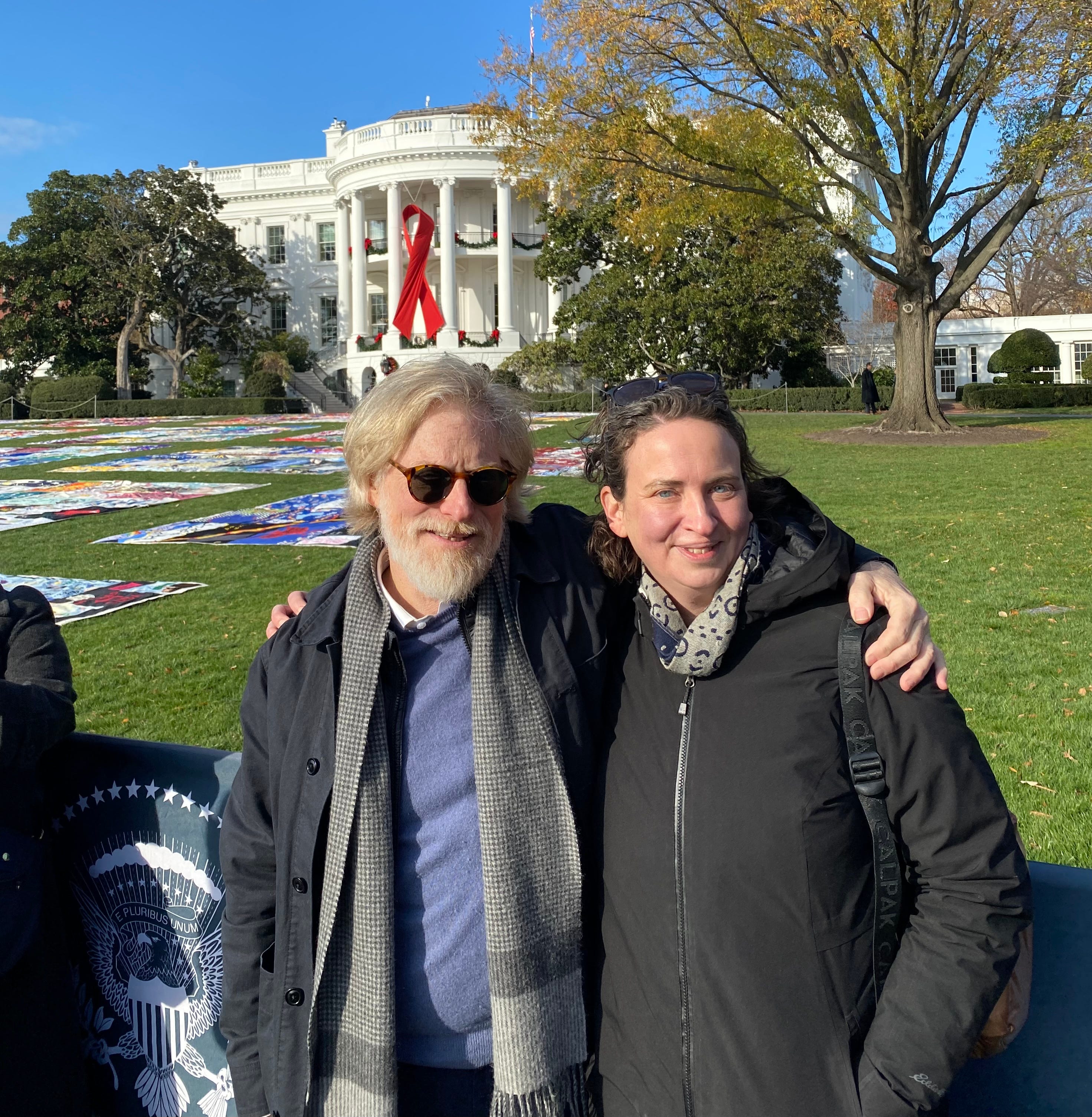 Alt text: A sandy-blonde haired, pale-skinned man with a beard, tortoiseshell sunglasses, a gray scarf, blue sweater and an overcoat, and a pale-skinned curly-haired woman with sunglasses perched on top of her head wearing a black overcoat stand in front of the White House. It has a giant red AIDS ribbon on it. Almost the height of the facade. There is a green lawn behind them with large squares of quilt laid out, and strips of green in between. That’s me and my dear friend, former colleague, and this Substack’s first guest DJ, Mitchell Warren, Executive Director of AVAC. We are at the White House World AIDS Day event on December 1, 2024. We are smiling and we have our arms around each other’s shoulders. We have no idea what is coming. On February 10 2025, AVAC sued President Trump, the State Department, the US Agency for International Development and other, seeking emergency relief from the Executive Order that inhumanely froze all funding for foreign assistance.