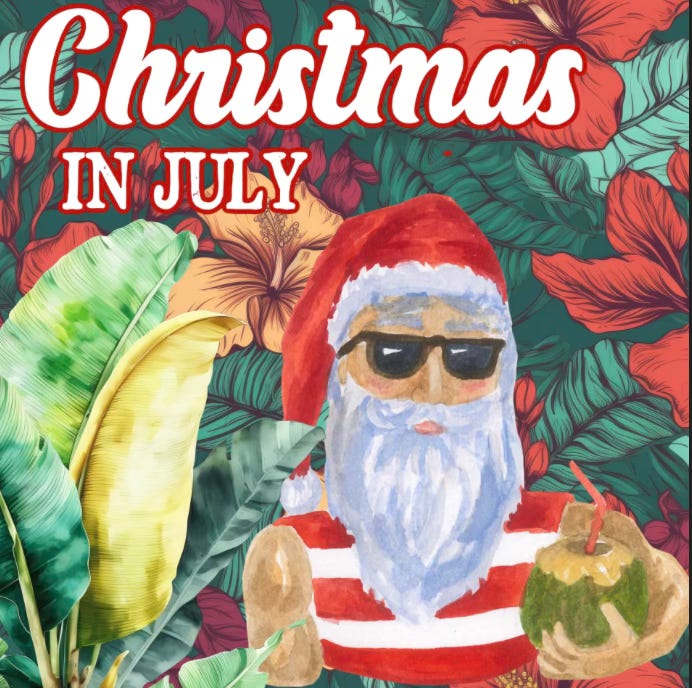 Alt text: A white-bearded person with pale skin, sunglasses, a red stocking cap with a pom-pom, and a red and white striped short sleeved shirt holding a coconut with a cocktail straw in a drink. There are large tropical leaves behind the figure, who is Santa Claus. The caption says: Christmas in July. For some people, Christmas is not a thing. For people for whom Christmas is a thing, it is not in July. It’s on December 25. World AIDS Day is on December 1.